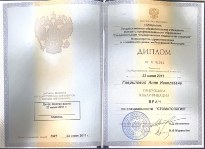 - Интернатура: Ставропольская государственная медицинская академия / Стоматология общей практики и детская стоматология, 2012 г.
