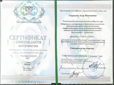 - Первичная переподготовка: Ставропольский государственный медицинский институт повышения квалификации КарьераМедиФарм / Стоматология детская, 2016 г.