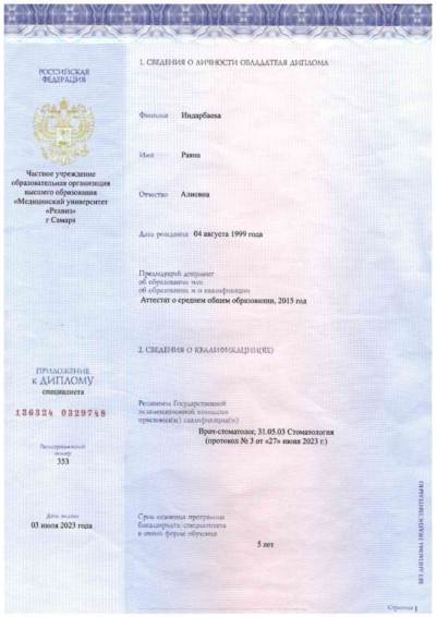 - Частное учреждение образовательная организация высшего образования «Медицинский университет «Реавиз» / Стоматология, 2023 г.