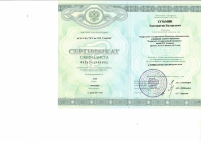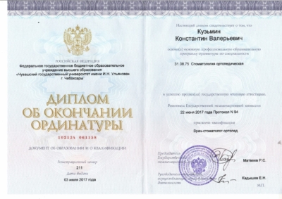 - Ординатура: Федеральное государственное бюджетное образовательное учреждение высшего профессионального образования «Чувашский государственный университет имени И.Н. Ульянова» / Ортопедическая стоматология, 2017 г.