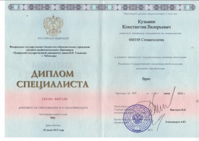 - Федеральное государственное бюджетное образовательное учреждение высшего профессионального образования «Чувашский государственный университет имени И.Н. Ульянова» / Стоматология, 2015 г.