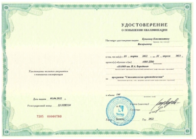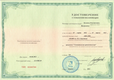 - Автономная некоммерческая организация дополнительного профессионального образования «Национальная академия медицинского образования имени Н.А. Бородина». Повышение квалификации по программе «Стоматология ортопедическая», 2022 г.