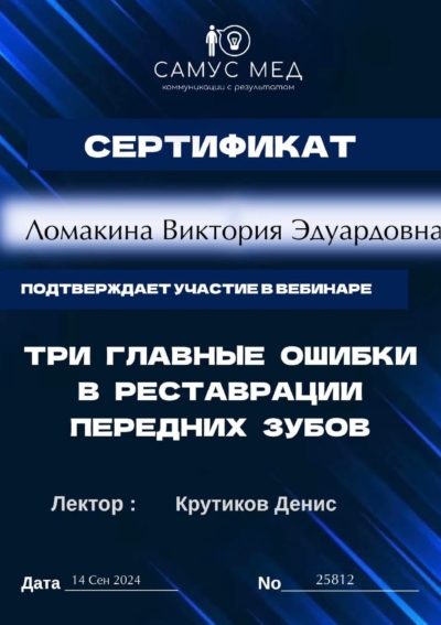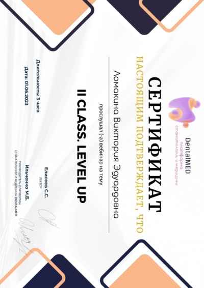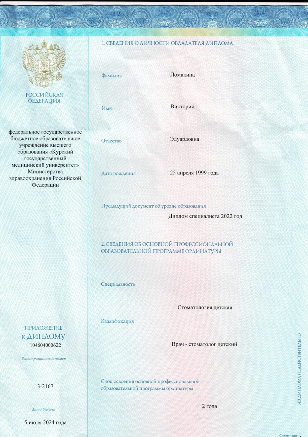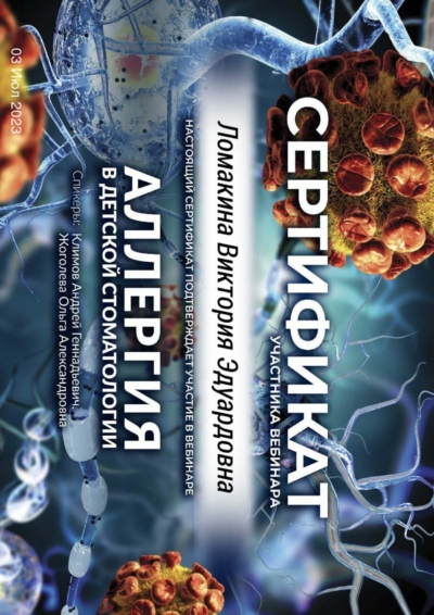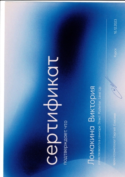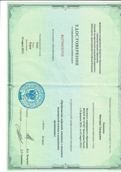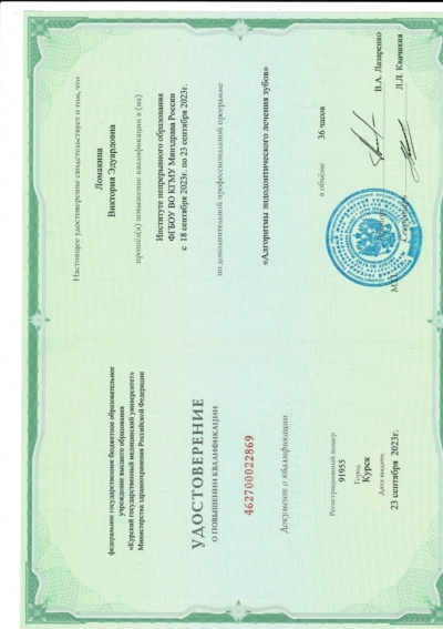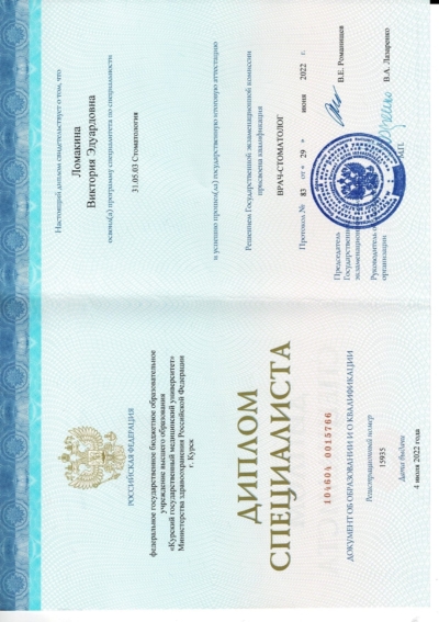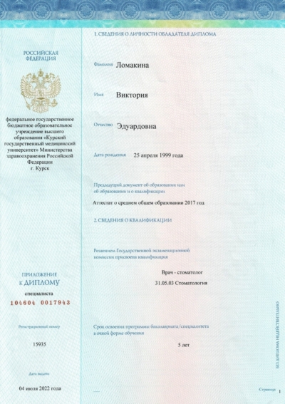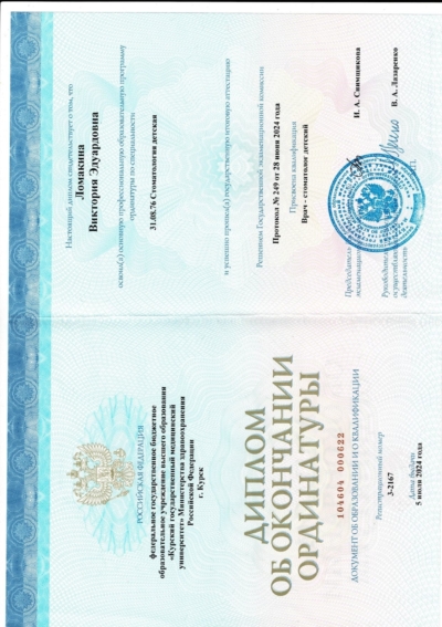 - Ординатура: Курский государственный медицинский университет Министерства здравоохранения Российской Федерации г. Курск / Детская стоматология, 2024 г.