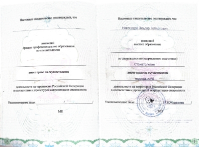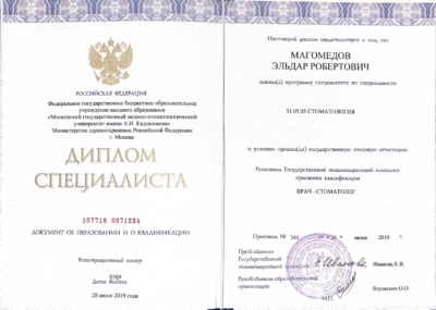 - Интернатура: НМИЦ Центральный научно-исследовательский институт стоматологии и челюстно-лицевой хирургии / «Стоматология хирургическая», 2021 г.