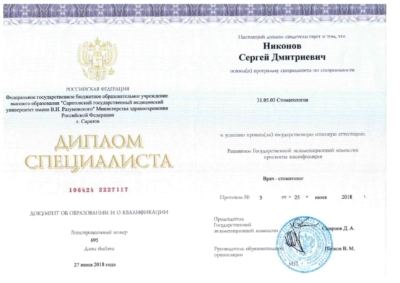 - Саратовский государственный медицинский университет им. В.И.Разумовского / Стоматология, 2018 г.