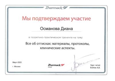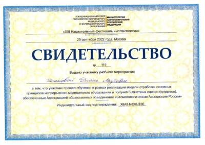 - Координационный совет по развитию непрерывного медицинского и фармацевтического образования. Министерство Здравоохранения РФ. Курс непрерывного медицинского образования «Стоматологическая Ассоциация России». «XII Национальный фестиваль имплантологии», 2022 г.