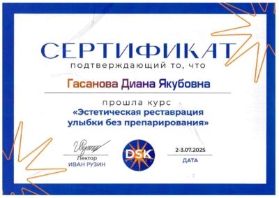 - Dentsply Sirona Academy. Лекционно-практический курс: «Системный подход для успешной реставрации фронтальной группы зубов», 2023 г.