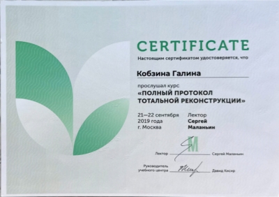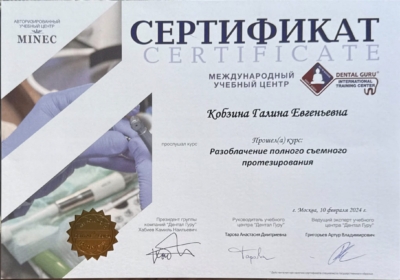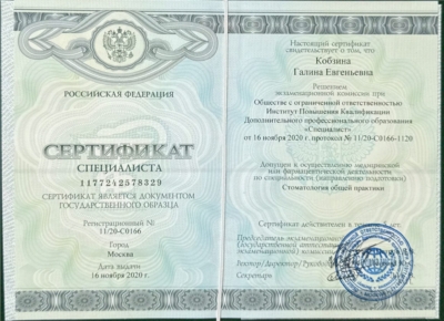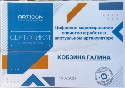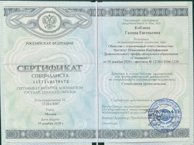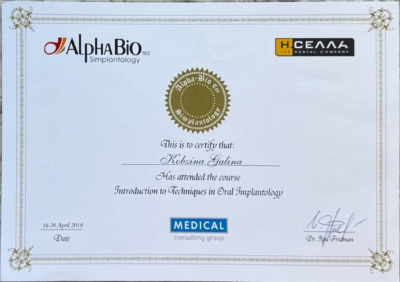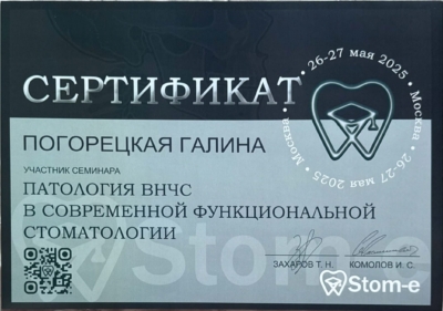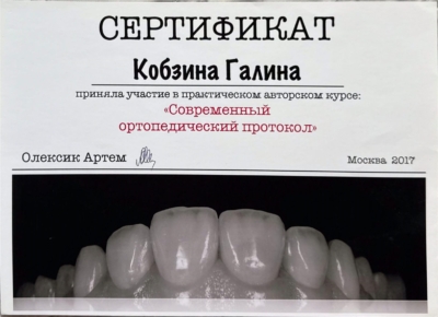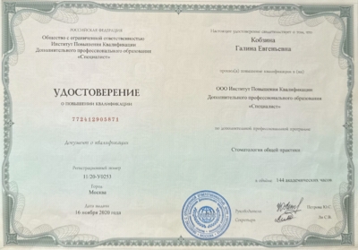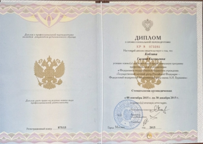 • Профессиональная переподготовка: ФГБУ «Государственный научный центр РФ Федеральный медицинский биофизический центр имени А.И. Бурназяна» / Ортопедическая стоматология, 2015 г.