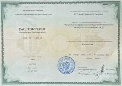 • Интернатура: МГМСУ им. А. И. Евдокимова, Научно-исследовательский медико-стоматологический институт / Стоматология ортопедическая, 2015 г.