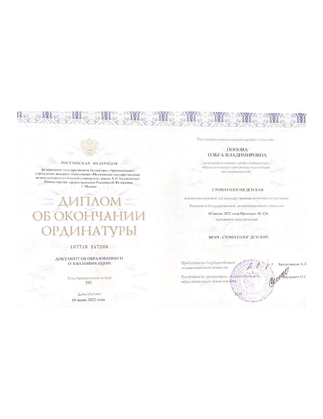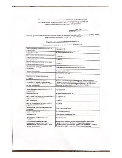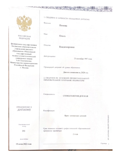 - Ординатура: ФГБОУ ВО МГМСУ им. А.И. Евдокимова Минздрава России / Детская стоматология, 2024 г.