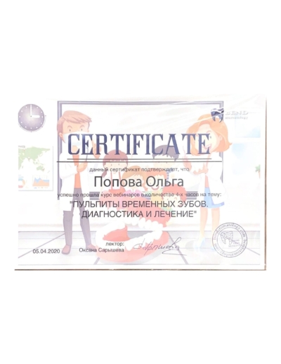 - Лектор Сарышева О.С. Курс вебинаров «Пульпиты временных зубов. Диагностика и лечение», 2020 г.