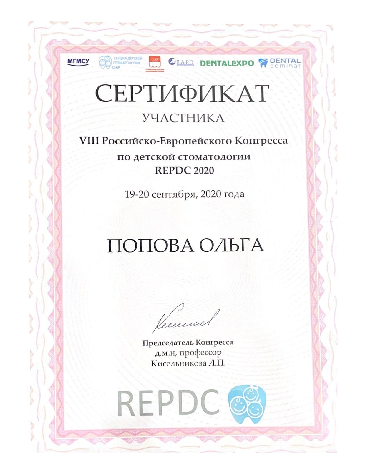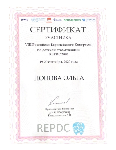 - VIII Российско-европейский конгресс по детской стоматологии г. Москва, 2020 г.