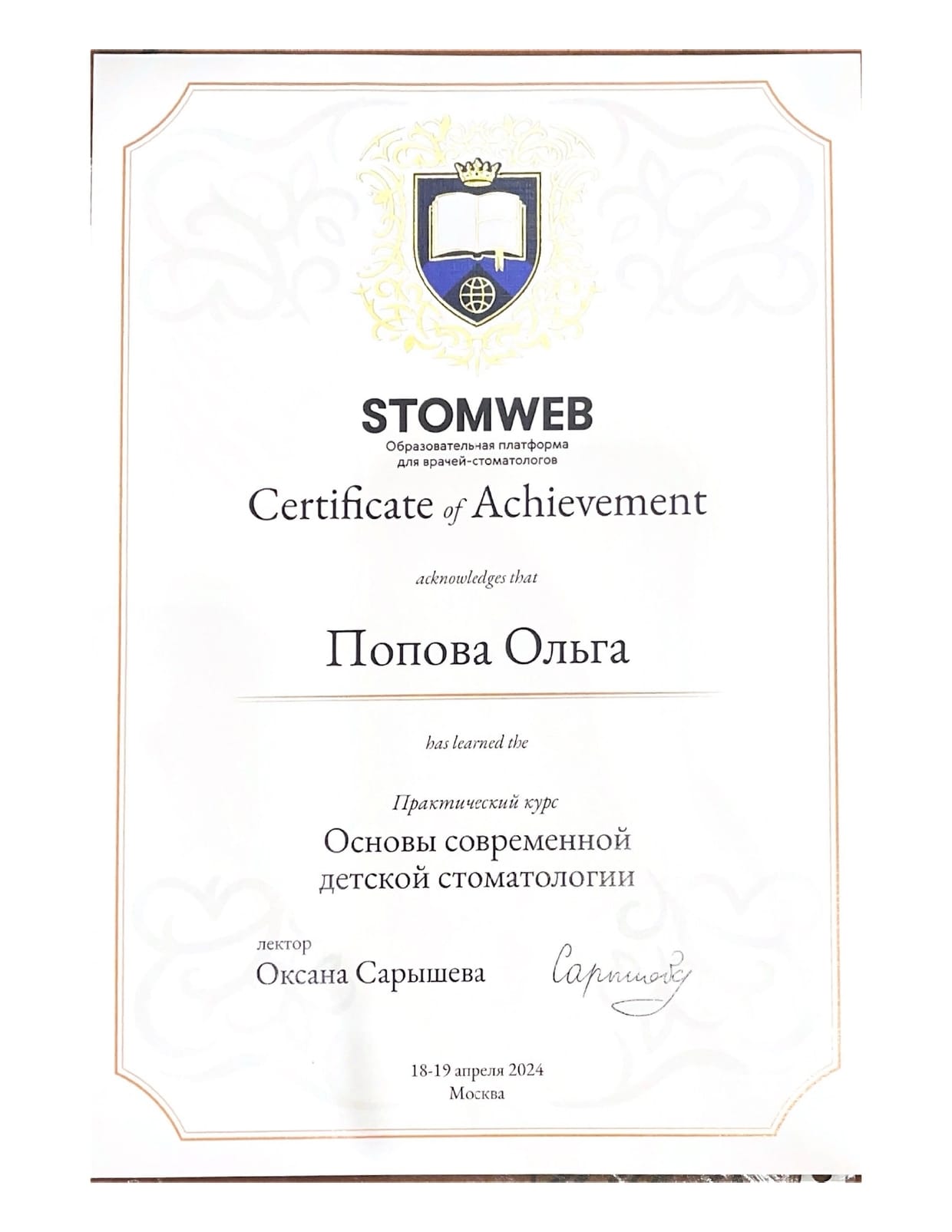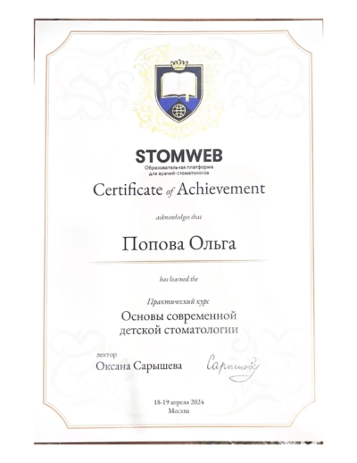 - Лектор О. Сарышева. Практический курс «Основы современной детской стоматологии», 2024 г.