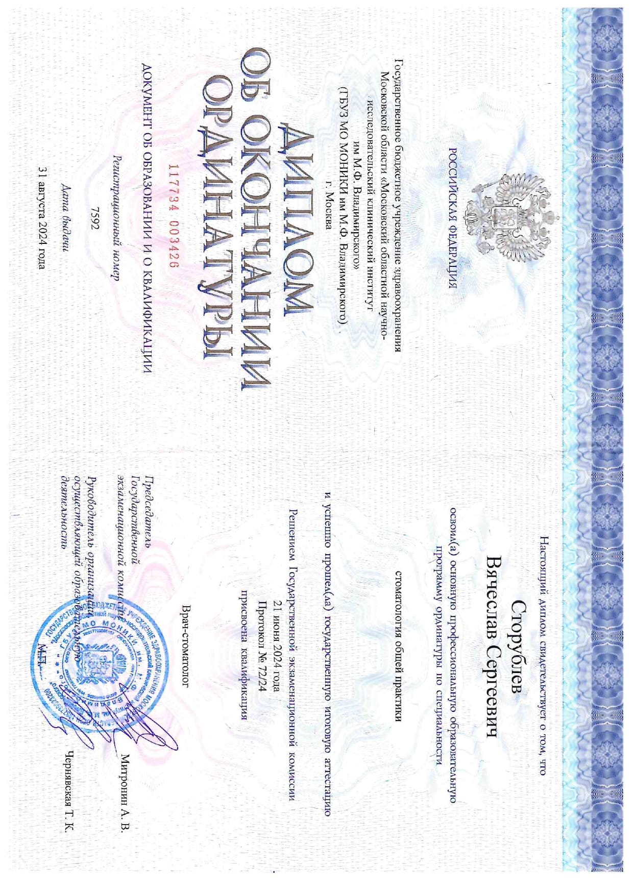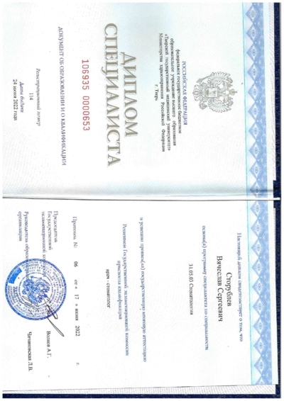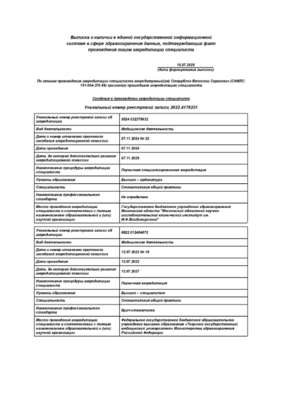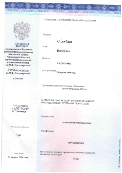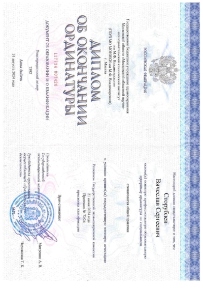 - Ординатура: Московский областной научно-исследовательский клинический институт имени М. Ф. Владимирского / Стоматолог общей практики, 2024 г.