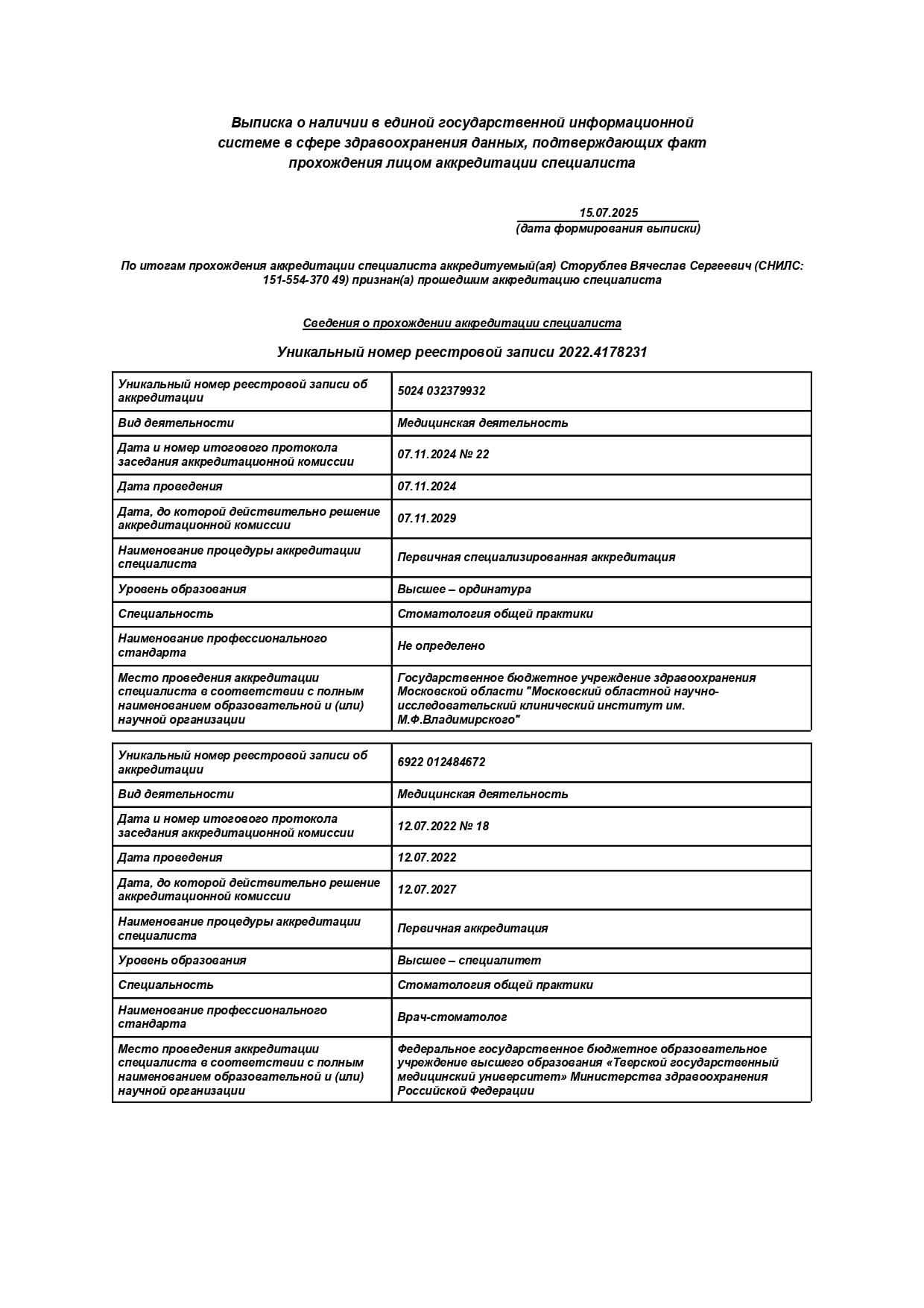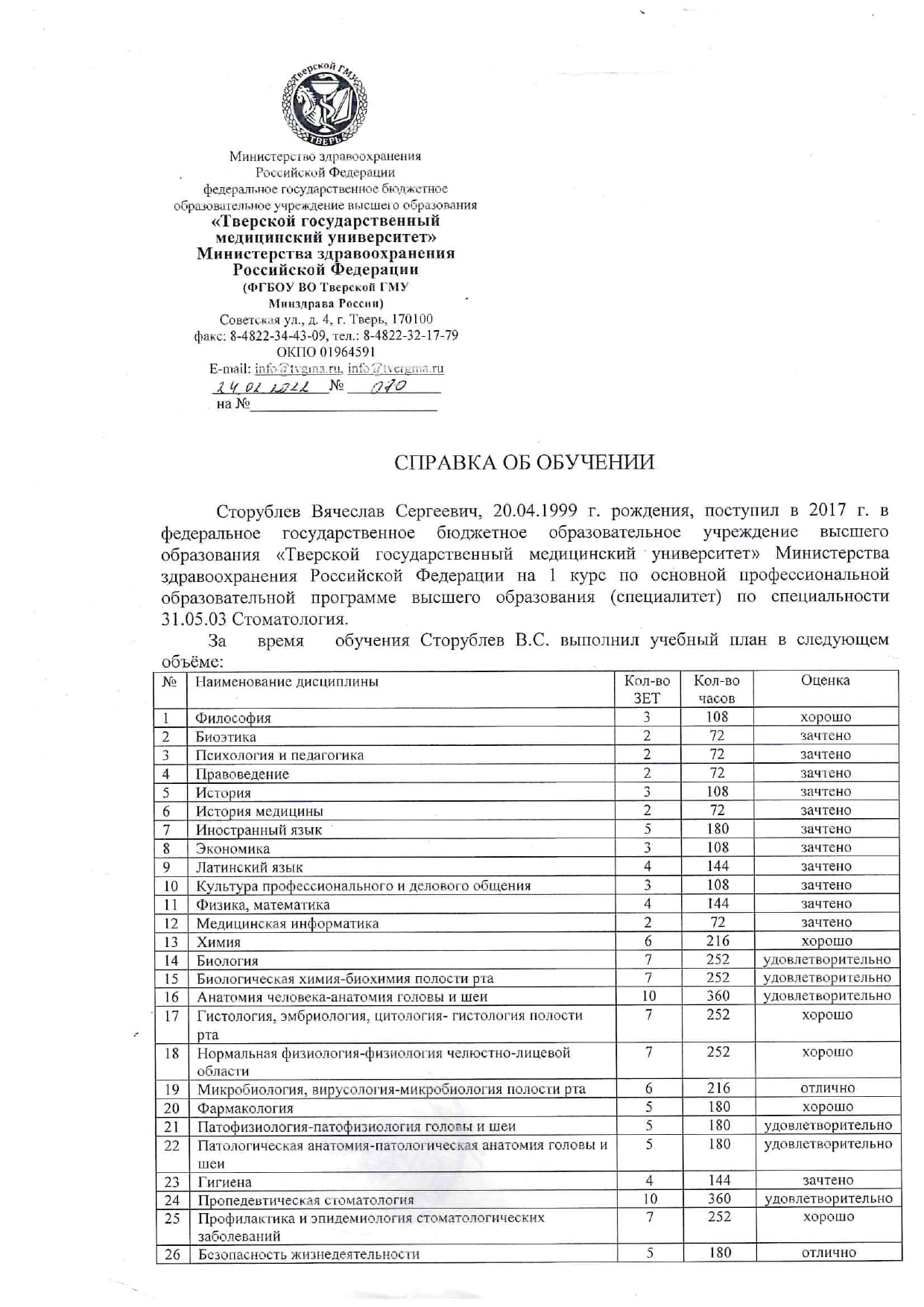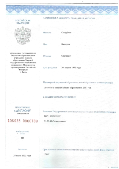- Тверской государственный медицинский университет / Стоматология, 2022 г.